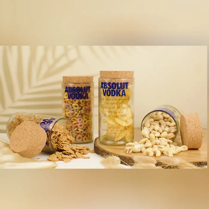 These jars are made from an upcycled absolute vodka bottle with cork lead. This is the perfect example of a sustainable, unique jar for your home.