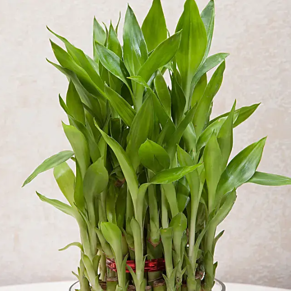 - Name of Plant: Three Layer Lucky Bamboo; Location: Indoors; Height: Up to 8 inches; Shape: Matki Glass Vase; Pebbles: White; Bamboo Trivia: